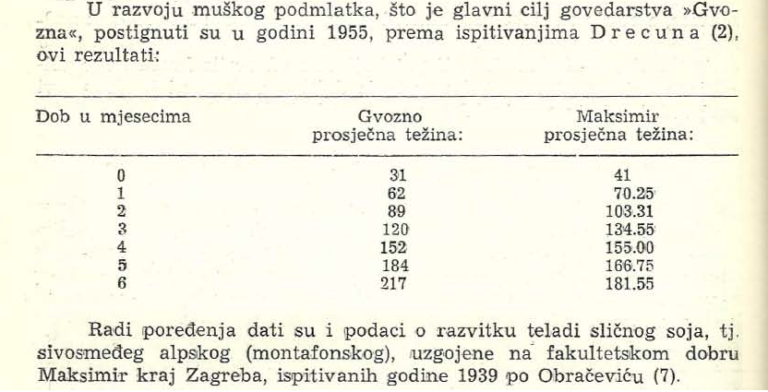 osobina muškog podmladka, a navode se i poređenje između tova bičića na Gvoznu i u tovu muške i ženske teladi poljoprivrednoj stanici Maksimir, kod Zagreba, kao što je prikazano na slici ispod.