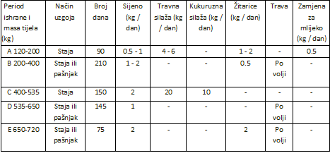 U tabelama 1. i 2. prikazan je plan ishrane ove kategorije goveda i količina hraniva u zavisnosti od uzrasta životinje. Plan podrazumjeva ishranu teleta od početne mase 120 kg bez prisustva krave dojilje.